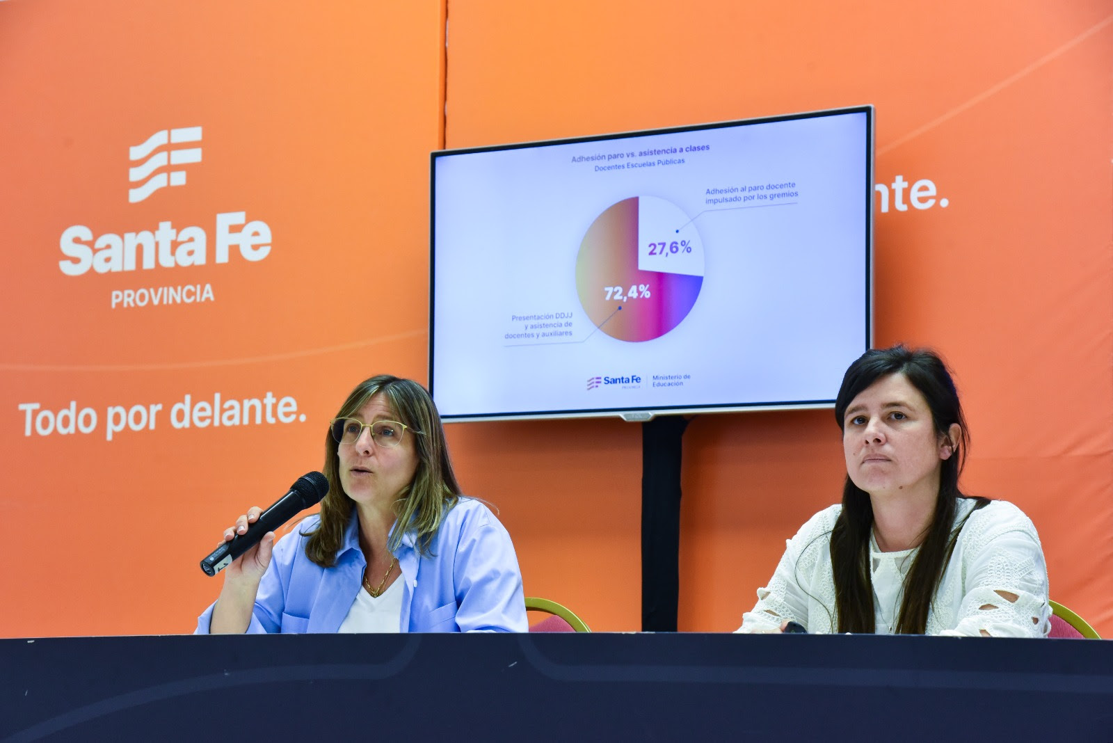Por su parte, la subsecretaria de Innovación e Integración Digital, Ana Bacolla, detalló: “Al relevamiento lo hicimos a través del sistema Mi Legajo, que es el mismo que utilizamos en las oportunidades anteriores” y en ese sentido informó: “El universo total de los docentes que debían llenar la declaración jurada son 57.336 personas y hasta el momento relevamos que presentaron su declaración jurada 41.514 trabajadores. Estos números, vistos en porcentaje de adhesión, representan una adhesión al paro del 27,6 % y una no adhesión del 72,4 %”.
