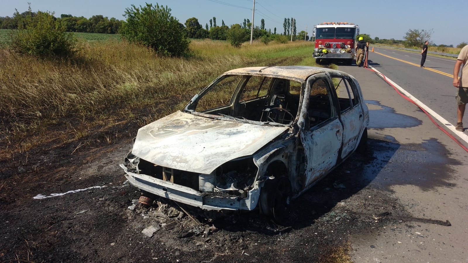 Personal policial del Destacamento 6º de Rueda con colaboración de la Comisaría 5ª de Empalme; asistió a un vecino de nuestra ciudad en la ruta 90 tras recibir una alerta de la central 911 sobre un foco ígneo. Al arribar al lugar, los efectivos constataron la presencia de un automóvil Renault Clio de color verde que se encontraba afectado por las llamas. El conductor del rodado -un joven con domicilio en Villa Constitución- explicó a las autoridades que, al notar la presencia de humo proveniente del sector del motor, decidió estacionar el vehículo en la banquina para inspeccionar la falla.