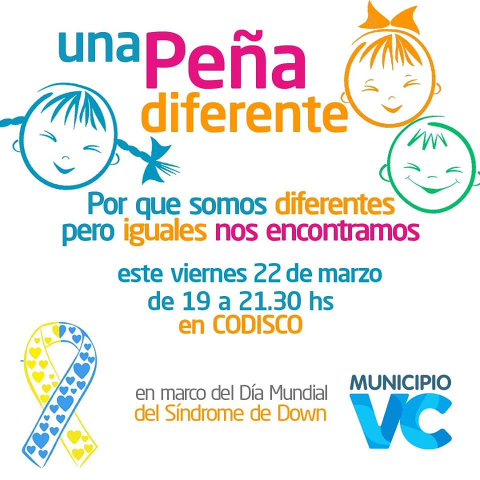 En el marco del Día Mundial del Síndrome Down que se celebra el 21 de marzo, el Municipio a través de la Mesa de la Discapacidad llevará a cabo una "Peña Diferente" en la instalaciones de Codisco, organizada conjuntamente con las instituciones de la ciudad.