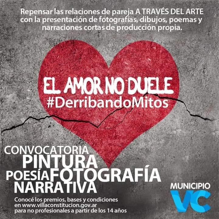 El concurso “Derribando mitos. El amor no duele” propone desnaturalizar la idea de amor a pesar de todo y a costa de todo que genera tanto dolor emocional. “En base a ello, invitamos a presentar obras artísticas y literarias relacionadas a esta temática. La propuesta es vivir el amor, no sobrevivirlo”. Podrán participar del concurso personas no profesionales a partir de los 14 años con residencia en la ciudad de Villa Constitución.