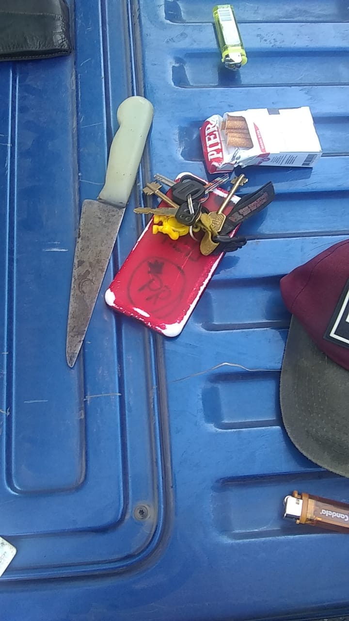 El día lunes a las 7.50, personal policial patrullaba la ciudad, en intersección de las calles Misiones y Bolívar. Observa a tres individuos, a los que pretende identificar. Momentos antes del cacheo, uno de los efectivos divisa en la mano de derecha de uno de ellos, un cuchillo.