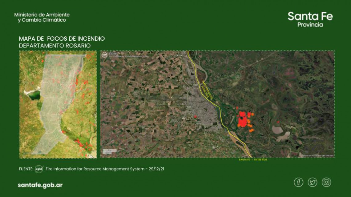 Respecto a la zona de Rosario, la ministra explicó que “el foco más grande se encuentra dentro de la zona del PIECAS, en el Delta del río Paraná, en jurisdicción de la provincia de Entre Ríos”. “Allí se han afectado ya más de 1600 hectáreas en los últimos 5 días lo que trae de la mano la pérdida debiodiversidad y afecta, sin dudas, a toda la flora y fauna de la zona”, continuó Gonnet. Sumado a esto, se desataron pequeños focos, en territorio santafesino, en la Isla Sabino Corsi.