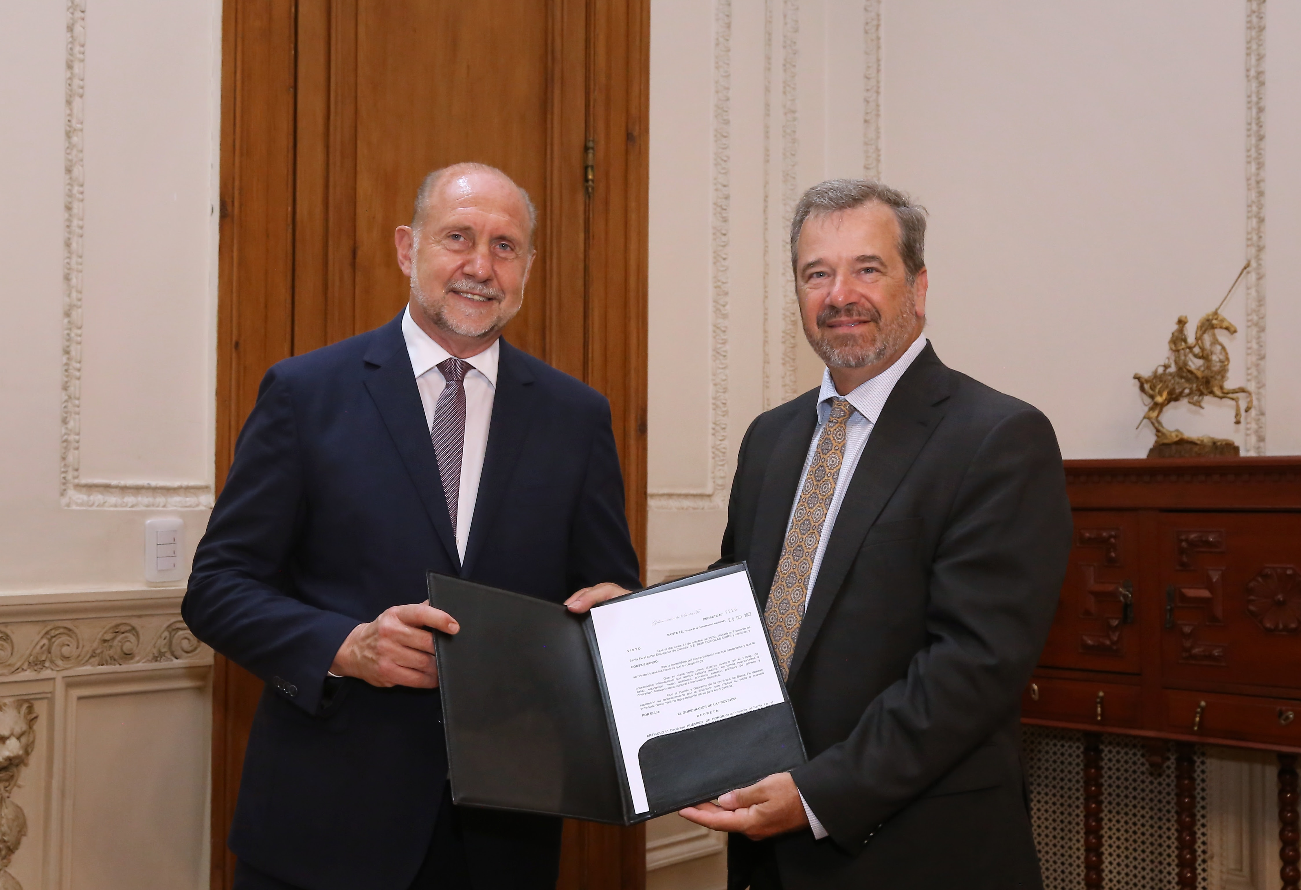 El gobernador de la provincia, Omar Perotti, acompañado por la secretaria de Cooperación Internacional e Integración Regional, Julieta de San Félix, se reunió este lunes en Rosario, con el embajador de Canadá en Argentina, Reid Sirrs.