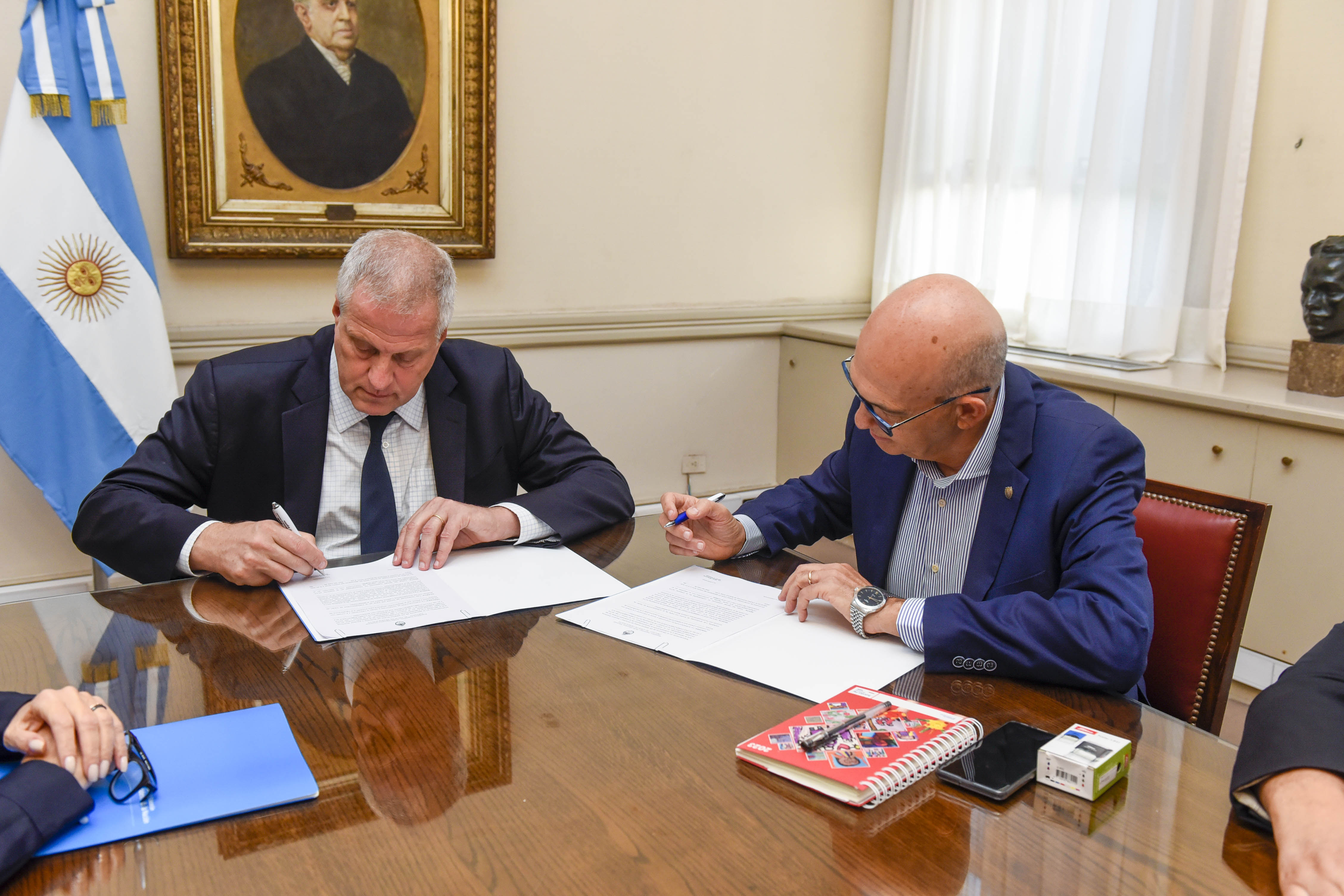 | El ministro de Educación, Víctor Debloc, junto al ministro de Educación de la Nación, Jaime Perczyk, firmaron el convenio para que la totalidad de las escuelas primarias de gestión estatal de la provincia de Santa Fe sumen una hora más de clase por día.