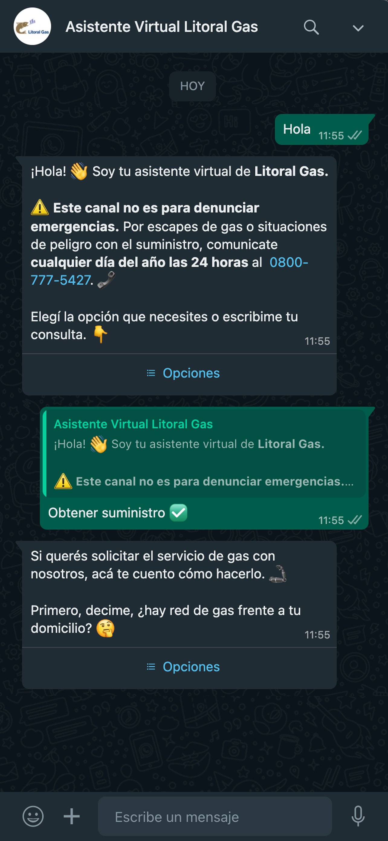 Litoral Gas tiene un nuevo canal para comunicarse con sus clientes. El chatbot -que funciona desde litoralgas.com.ar, y en el 341 7791429 de WhatsApp- es una herramienta de asistencia virtual activa durante las 24 horas todos los días del año.